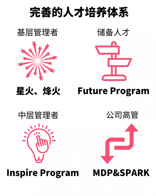 針對(duì)分公司總經(jīng)理與公司高管,分別設(shè)計(jì)“MDP”、“SPARK”,進(jìn)一步拓寬視野,推動(dòng)公司創(chuàng)新與變革。