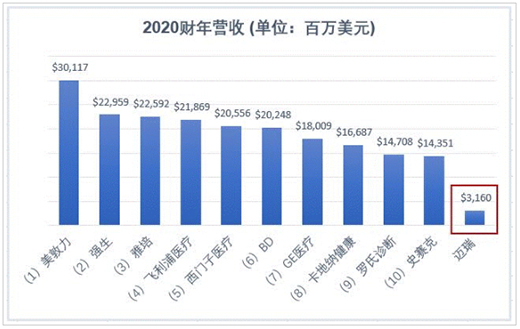 圖1 2020年度全球排名前10醫(yī)療器械公司與邁瑞公司營收對比