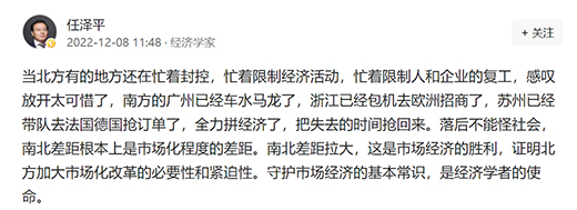 “當(dāng)北方有的地方還在忙著封控,忙著限制經(jīng)濟(jì)活動(dòng),忙著限制人和企業(yè)的復(fù)工,感嘆放開(kāi)太可惜了,南方的廣州已經(jīng)車水馬龍了,浙江已經(jīng)包機(jī)去歐洲招商了,蘇州已經(jīng)帶隊(duì)去法國(guó)德國(guó)搶訂單了,全力拼經(jīng)濟(jì)了,把失去的時(shí)間搶回來(lái)。落后不能怪社會(huì),南北差距根本上是市場(chǎng)化程度的差距。南北差距拉大,這是市場(chǎng)經(jīng)濟(jì)的勝利,證明北方加大市場(chǎng)化改革的必要性和緊迫性。守護(hù)市場(chǎng)經(jīng)濟(jì)的基本常識(shí),是經(jīng)濟(jì)學(xué)者的使命?!币陨鲜墙?jīng)濟(jì)學(xué)家任澤平發(fā)在今日頭條的一段話,這段話有深意?!畵層唵巍@個(gè)詞現(xiàn)在也在網(wǎng)絡(luò)上出圈了,為什么出現(xiàn)這個(gè)情況,國(guó)創(chuàng)聯(lián)行為您解讀,我們了解一下近期動(dòng)態(tài)。