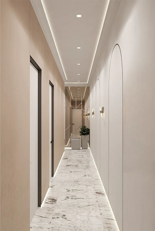 室內(nèi)空間運(yùn)用燈帶設(shè)計(jì),可以很好地表現(xiàn)出燈光的層次感,讓空間環(huán)境更為柔和,有情調(diào)。在極簡的空間形態(tài)中,燈帶還可以賦予其攝人心魄的層次美??梢愿鶕?jù)需求靈活呈現(xiàn)自己的形態(tài),或直線、或彎曲,然后以燈光來提高空間的立體感和層次感。