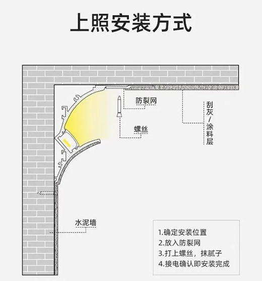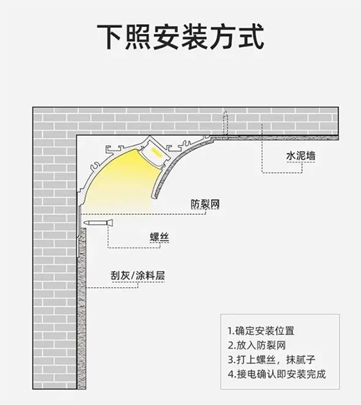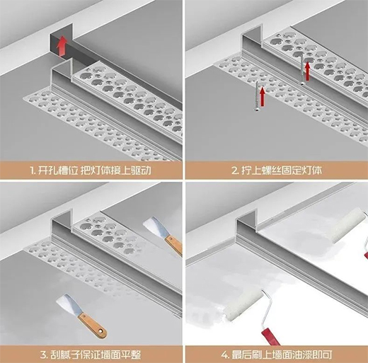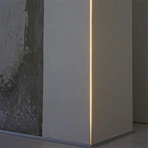 墻角鋁槽燈帶安裝簡單:開墻后安裝型材,固定型材,抹膩?zhàn)踊揖桶惭b完成了。