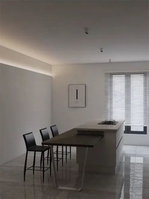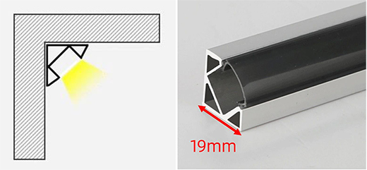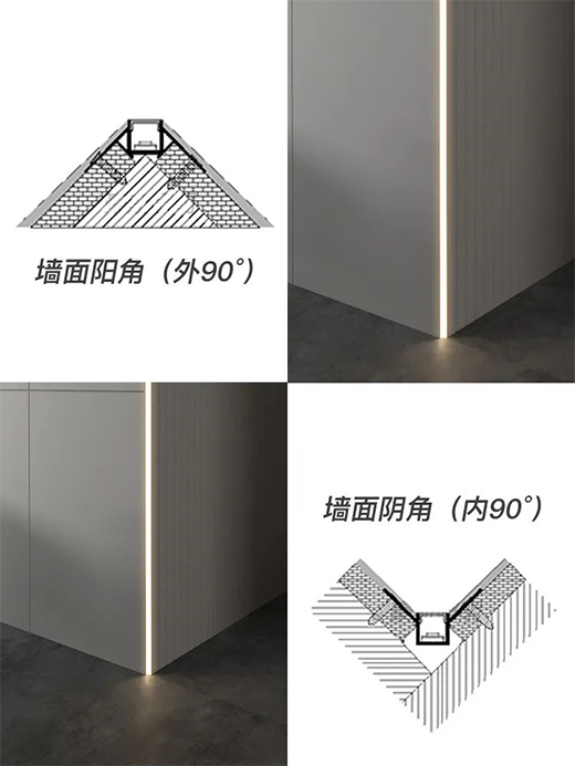與以上三種做法相比,陽角帶鋁槽的燈帶比較小?;景惭b在墻面的轉(zhuǎn)角處,可以解決陽角處不同材料之間的封閉問題,弱化墻面的邊角,具有很強(qiáng)的裝飾效果,提升空間的時(shí)尚氣質(zhì)。這種燈帶型材有陰角款和陽角款兩種,更推薦陽角款,顏值更高,功能更多。