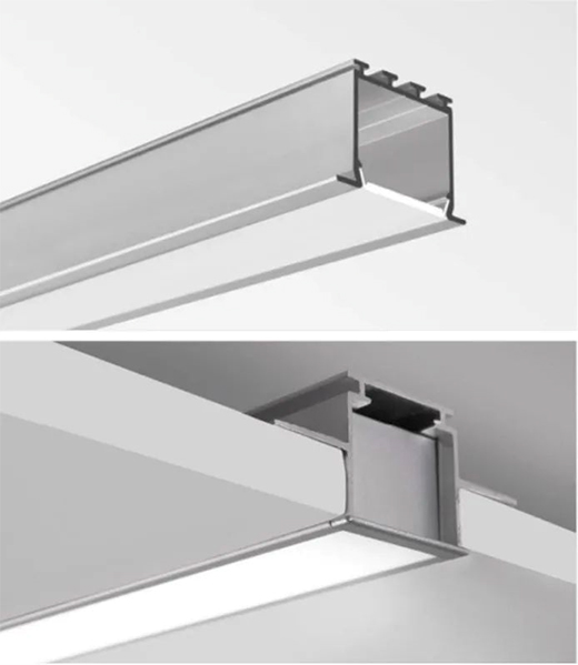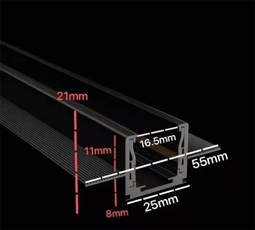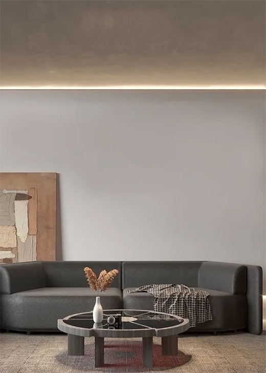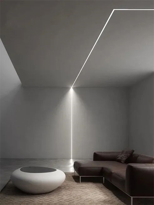 這種鋁槽燈帶最薄的型材在10mm左右,有邊框型材和無邊框型材兩種形式,會(huì)讓款式和效果更加簡潔。安裝方便,只需在安裝位置開槽10mm,對(duì)墻面無任何影響。