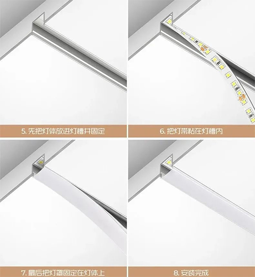 邊角款鋁槽燈帶,安裝方式超級(jí)簡單,不需要開槽就可以直接安裝。安裝底座卡扣,夾住燈槽,蓋上PC面罩。就只需要前期需要預(yù)留好燈線位置,這是最方便簡單的燈帶了。