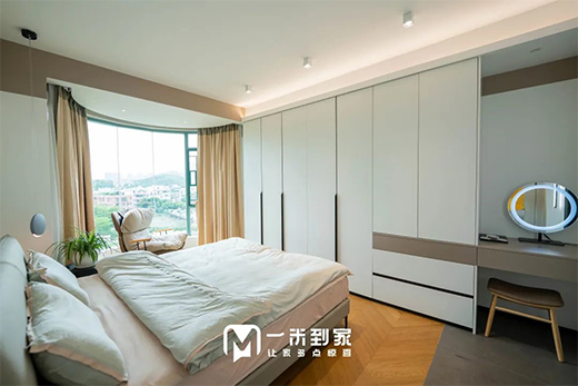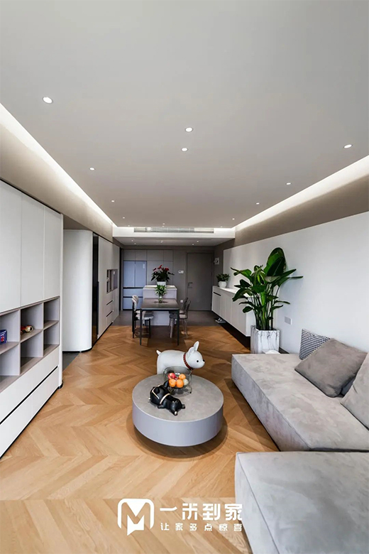 在天花板吊頂嵌入燈帶,也就是我們現(xiàn)在流行的“無主燈設計”,當我們開燈后,光源帶由近到遠的漸變,空間也隨之舒展。