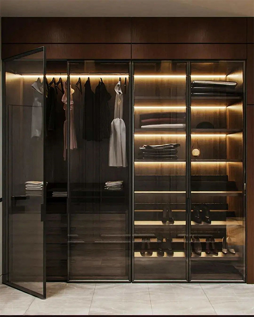 玻璃透視衣櫥的燈帶設計,無論是作展示還是存放衣物,在光源底下的展示品和衣物都自帶“高級感濾鏡”。