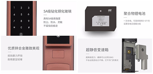 Hobere-H5采用5A級鉆化鋼化玻璃,可達到耐刮、耐磨、耐臟的絕佳效果;采用優(yōu)質鋅合金材質的面板,硬度、強度高,且雅致美觀,視覺效果強;采用聚合物鋰電池,節(jié)約環(huán)保,安全可靠,使用壽命長;采用超靜音變速箱,超高級扭力,超充沛動力,開門順暢;采用經過特殊防水防潮處理的電路板,經久耐用。