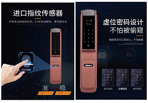 (2)密碼開鎖:Hobere-H5虛位密碼設計,有效防止外人偷窺,且連續(xù)5次密碼驗證失敗,智能鎖會自動報警并鎖定系統(tǒng),讓“不法分子”無機可乘。