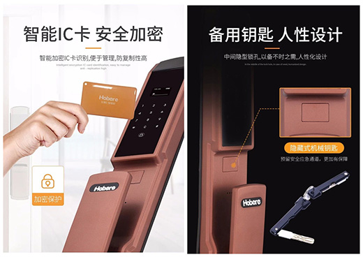 (3)刷卡開鎖:Hobere-H5為用戶提供創(chuàng)新研發(fā)的智能加密IC卡,其防復制性能好,安全系數(shù)高。