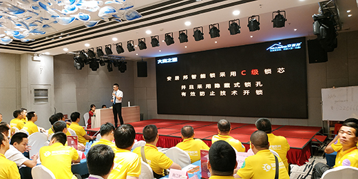 在“生產(chǎn)揭秘之旅”過后,內(nèi)容豐富的安居邦交流會正式開始!伴隨著熱烈的掌聲,安居邦市場部湯經(jīng)理上臺圍繞安居邦智能鎖產(chǎn)品的功能、亮點、賣點等幾大方面展開了深入淺出的精彩演講,成功贏得全場雷鳴般的掌聲!