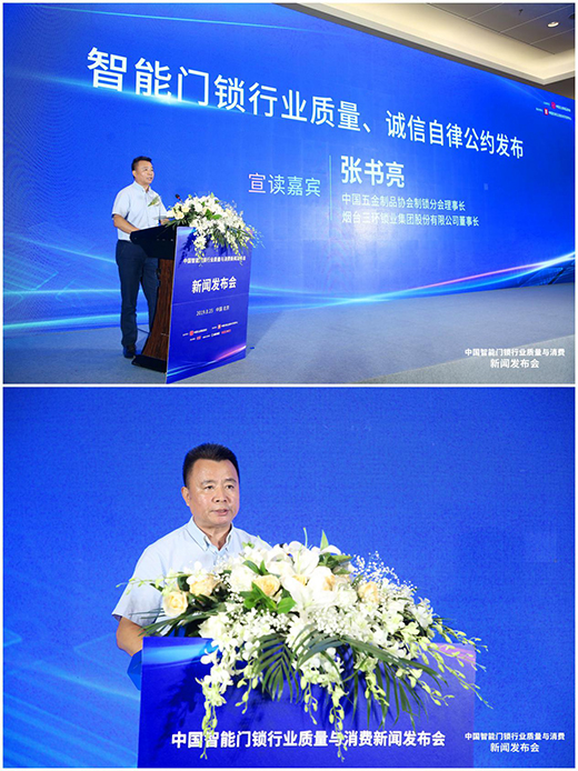 中國(guó)輕工業(yè)聯(lián)合會(huì)秘書(shū)長(zhǎng)杜同和、國(guó)家市場(chǎng)監(jiān)督管理總局質(zhì)量發(fā)展局質(zhì)量處處長(zhǎng)高勇、中國(guó)五金制品協(xié)會(huì)理事長(zhǎng)石僧蘭、中國(guó)五金制品協(xié)會(huì)執(zhí)行理事長(zhǎng)張東立、中國(guó)日用五金技術(shù)開(kāi)發(fā)中心主任畢智濤、紫光國(guó)微總裁馬道杰、中國(guó)五金制品協(xié)會(huì)制鎖分會(huì)理事長(zhǎng)、煙臺(tái)三環(huán)鎖業(yè)集團(tuán)股份有限公司董事長(zhǎng)張書(shū)亮共同啟動(dòng)了“智能門鎖消費(fèi)指南”發(fā)布儀式。