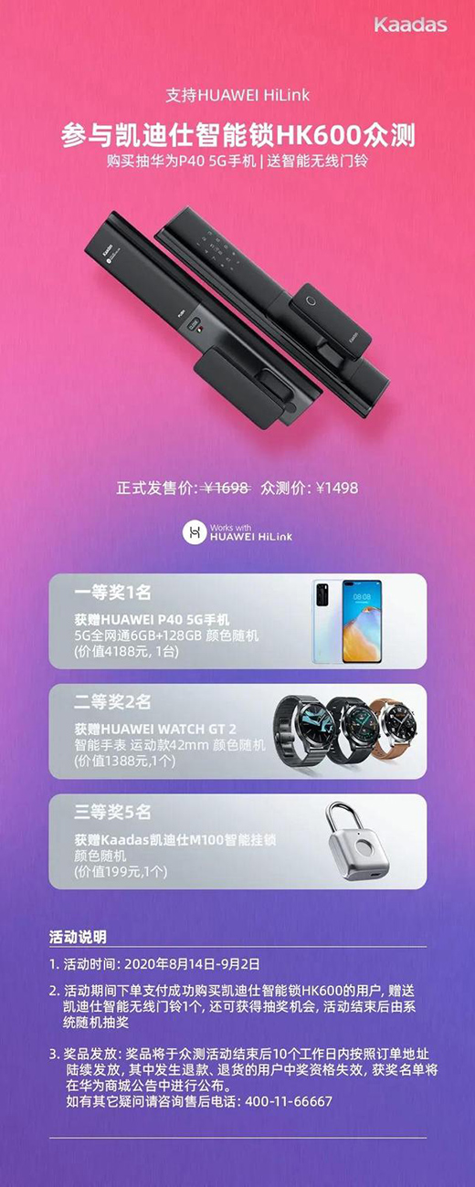 8月14日-9月2日活動(dòng)期間,凱迪仕HK600智能鎖原價(jià)1698元,眾測首發(fā)價(jià)1498元,下單購買即贈(zèng)送凱迪仕智能無線門鈴,眾測期間,還有機(jī)會(huì)獲得驚喜好禮!凡在華為商城購買凱迪仕HK600智能鎖的伙伴們,均有機(jī)會(huì)抽取華為P40 5G手機(jī)、HUAWEI WATCH GT 2智能手表、凱迪仕M100智能掛鎖。禮品多多,不可錯(cuò)過哦~