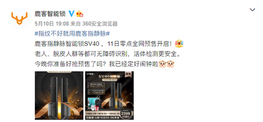 5月10日,@鹿客智能鎖官方微博發(fā)文稱:5月11日零點,鹿客指靜脈智能鎖SV40將開啟全網(wǎng)預售。