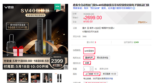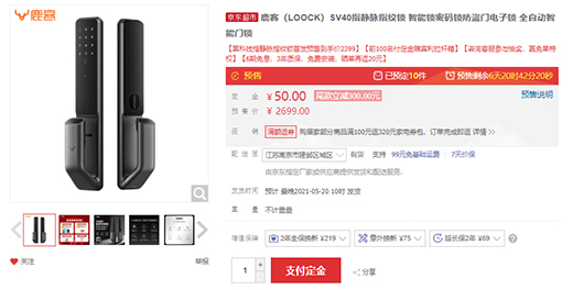 目前,在天貓、京東平臺,鹿客指靜脈智能鎖SV40均已上架預售,時間為7天。
