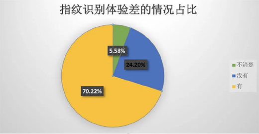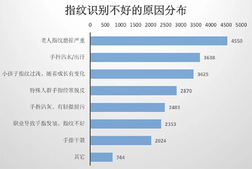 從原因分類來看,用戶年齡在很大程度上影響了指紋識別的使用體驗,指紋解鎖對老人或小孩來說識別率會受到較大影響,此外指紋因外界環(huán)境影響而發(fā)生變化,如季節(jié)性脫皮、沾水、干裂等,也會影響指紋識別。