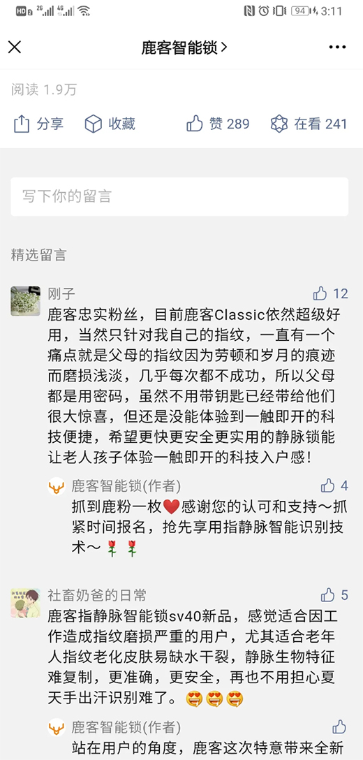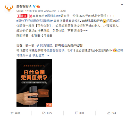 相比目前行業(yè)內(nèi)應用較多的指紋、人臉解鎖來說,靜脈識別鎖在產(chǎn)品方面還有可以優(yōu)化的地方,而用戶反饋就是收集這些信息最好的渠道。因此,通過鹿客官方渠道推出的靜脈智能鎖SV40“百臺眾測”免費領活動,可以看到鹿客收集用戶反饋,不斷優(yōu)化產(chǎn)品的決心。本次活動也吸引了眾多粉絲的關注和參與。
