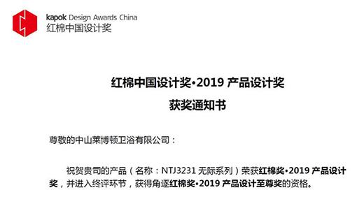 萊博頓NTJ3231無際系列淋浴房從4075件來自海內(nèi)外的參評作品中脫穎而出,獲得紅棉獎·2019產(chǎn)品設(shè)計獎的殊榮,并進(jìn)入終評環(huán)節(jié),獲得角逐紅棉獎·2019產(chǎn)品設(shè)計至尊獎的資格!