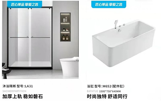 # 自潔坐便器 #強(qiáng)勁沖力,帶來高效潔凈;# 輕奢花灑 #高端雅致,雨淋水般的酣暢淋浴;# 淋浴隔斷 #堅固材質(zhì),帶來安心洗浴;# 時尚浴缸 #隨時隨地舒適泡澡。