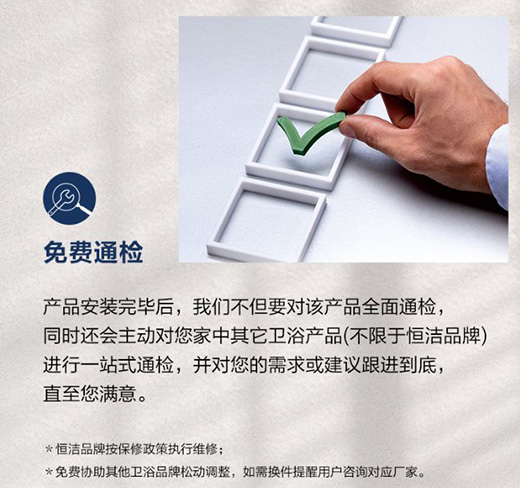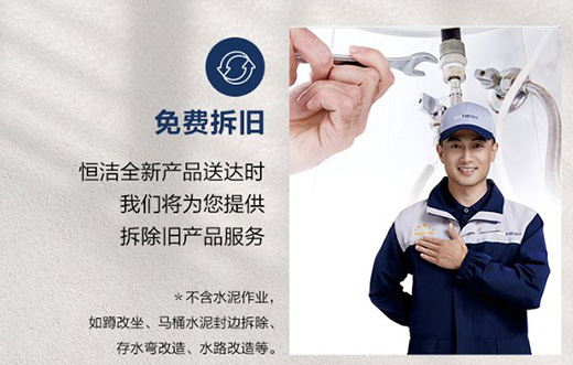 恒潔提供恒潔智能馬桶2小時快速換裝服務(wù),從舊品拆除到智能換新,升級品質(zhì)生活僅需2小時。(2小時:指上門服務(wù)到產(chǎn)品安裝完成,不含電路改造時間;更多產(chǎn)品換裝升級,請咨詢恒潔服務(wù)團隊。)