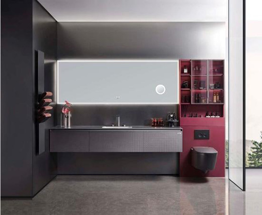 歐派衛(wèi)浴“魅力伯爵”系列,選擇極簡(jiǎn)門(mén)型的深灰色立體紋巖板,搭配魅惑紅啞光烤漆格柜,迸發(fā)沉穩(wěn)內(nèi)斂與熱情狂放的劇烈碰撞,帶來(lái)更突出的視覺(jué)沖擊感與設(shè)計(jì)高級(jí)感。一字型布局設(shè)計(jì)搭配門(mén)板與拉手的一體化設(shè)計(jì),從整體到細(xì)節(jié)一致實(shí)現(xiàn)簡(jiǎn)約質(zhì)感,明暗相間的肌理以及錯(cuò)落有致的布局都在簡(jiǎn)約感中加入?yún)f(xié)調(diào)的富于層次感的多元化設(shè)計(jì)元素,顯得更為精致。