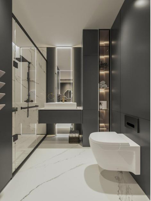 與“魅影伯爵”相對(duì)應(yīng),主要目標(biāo)消費(fèi)人群面向四十歲左右都市精英女性的“全能女王”通過(guò)仿科技木皮飾面搭配鱷魚(yú)皮紋,低調(diào)奢華的魅力滿(mǎn)溢而出。“全能女王”通體采用極簡(jiǎn)設(shè)計(jì),一體化布局與到頂式設(shè)計(jì),讓衛(wèi)浴空間顯得更為大氣而飽滿(mǎn),提升了布局格調(diào)。浴室柜采用咖色搭配米色,再加以香檳金點(diǎn)綴,極富輕奢高級(jí)感的配色帶來(lái)了更具消費(fèi)特色傾向的衛(wèi)浴空間。