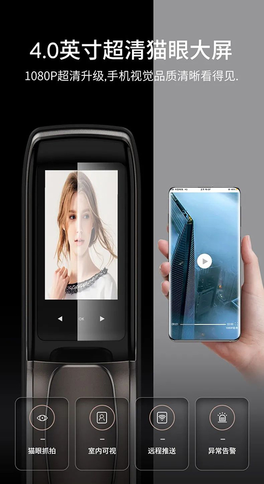 除了以上功能,希箭智能鎖R10流線型外觀上,還有一塊4.0英寸超清貓眼大屏最引人注目,1080P超清畫(huà)質(zhì)讓您在屋內(nèi)就可以把門(mén)外情況看得清清楚楚,安心又省心。