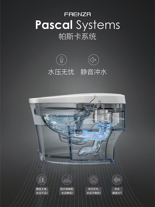 產(chǎn)品搭載FAENZA法恩莎創(chuàng)新研發(fā)的帕斯卡智能沖水系統(tǒng),突破高樓層與老舊城區(qū)水壓限制,無懼低水壓,同時(shí)實(shí)現(xiàn)靜音沖水。此外,還集成多項(xiàng)創(chuàng)新潔凈科技:凈瀾釉技術(shù)、智能潤(rùn)壁功能、噴槍自潔功能、UV紫外線殺菌技術(shù)、銀離子抗菌座圈、水氣混合清洗技術(shù)等,如此完美的外觀+功能,讓其成為名副其實(shí)的年度爆款單品。