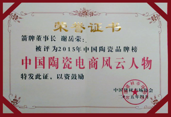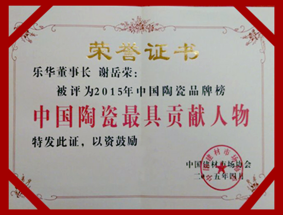 2015年4月21日,由中國陶瓷新聞網(wǎng)和佛山陶瓷網(wǎng)聯(lián)合發(fā)起,中國建材市場協(xié)會主辦的2015“中國陶瓷品牌榜”頒獎盛典在廣東省佛山市禪城區(qū)中國陶瓷產(chǎn)業(yè)總部基地陶瓷劇場3樓多功能會議中心隆重舉行。據(jù)悉,本次評選活動歷時半年之久,采用網(wǎng)絡(luò)投票形式,實行微信一人一票制度,過程公正而且嚴(yán)格。經(jīng)過激烈的投票角逐,樂華集團董事長謝岳榮先生獲得了“2015年中國陶瓷品牌榜——中國陶瓷最具貢獻人物”以及“2015年中國陶瓷品牌榜——中國陶瓷電商風(fēng)云人物”獎項。