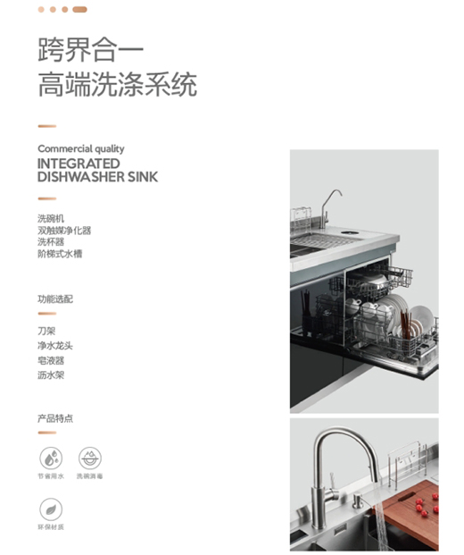 AX6009創(chuàng)新型一體式集成水槽是不同于傳統(tǒng)水槽的多功能水槽,除了水槽部分外,還配有獨立的8套嵌入式洗碗機(jī)、可選配自動垃圾處理器、洗杯器等系統(tǒng)和功能。新產(chǎn)品所配有的洗碗機(jī)分層設(shè)計,疊放自如,具有紫外線滅菌、自動烘干等功能,一鍵式輕松搞定洗碗問題,不再為洗碗而煩惱。自動垃圾處理器噪音低、粉碎凈,讓飯后殘余垃圾粉碎排出,零堵塞更環(huán)保。槽體的另一側(cè)配有獨立的洗杯器,讓清洗水杯、奶瓶、酒瓶更易潔方便。諾帝瑪廚衛(wèi)只有你想不到的,沒有他們做不到的,敢于挑戰(zhàn),敢于書寫,拒絕同質(zhì)化發(fā)展。