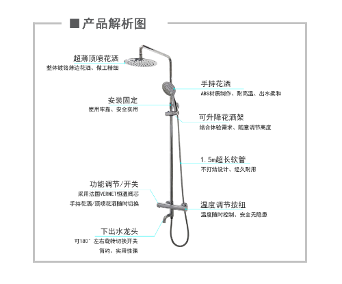 該款產(chǎn)品的超薄頂噴花灑,采用ABS材質(zhì)制作,整體鍍鉻薄邊花灑,做工精細,耐高溫,易清潔。并且采用了富氧技術,當空氣注入水中,水流更柔和更節(jié)水,使淋浴時水滴更豐盈。