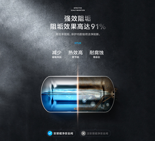 眾所周知,通常進(jìn)入到電熱水器中的水源都是市政自來水。由于自來水中大都含有鈣鎂離子,在經(jīng)過加熱后會產(chǎn)生水垢。日積月累會堆積在水箱壁和水管造成堵塞,影響熱水器使用壽命。美的磁凈活水系列電熱水器,在第一代活水基礎(chǔ)上添加磁凈垢濾芯,徹底實(shí)現(xiàn)“活水阻垢”。該技術(shù)打破了“等沉積物形成之后再上門清理”的常規(guī)思維,直接從“拒絕沉積物在水箱內(nèi)形成”上入手,從源頭上阻垢抑垢,徹底解決行業(yè)內(nèi)傳統(tǒng)電熱水器的弊端。