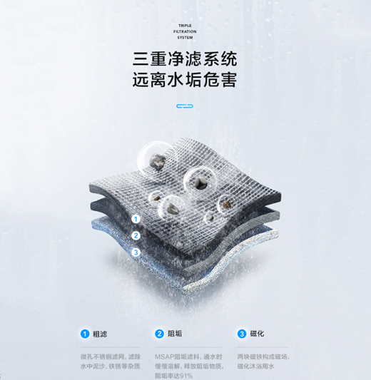 美的磁凈活水系列電熱水器在進(jìn)水管處增加磁凈垢濾芯,其中的抑垢因子能夠捕獲水中的鈣鎂離子,防止其與水中的碳酸根與氫氧根結(jié)合,阻止水垢產(chǎn)生,阻垢率高達(dá)91%!同時(shí),磁凈垢濾芯附帶的不銹鋼濾網(wǎng),可以濾除水中泥沙鐵銹,讓水質(zhì)更加純凈健康。美的更成為中國為首家以《化妝品安全技術(shù)規(guī)范》相關(guān)檢驗(yàn)要求為標(biāo)準(zhǔn),通過了RoHS十項(xiàng)測試、人體皮膚測試、毒理學(xué)測試等多項(xiàng)測試,充分證明磁凈濾芯材料對人皮膚健康無刺激。