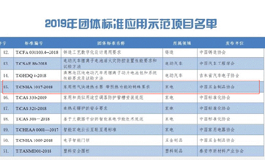 在工信部18日公布的2019年團體標(biāo)準(zhǔn)應(yīng)用示范項目名單中,中國五金制品協(xié)會團體標(biāo)準(zhǔn)《家用燃氣快速熱水器帶預(yù)熱功能的特殊要求》(T/CNHA 1017-2018)入選。