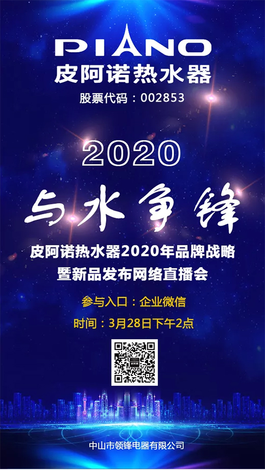 受疫情影響,“與水爭鋒”——2020皮阿諾熱水器品牌戰(zhàn)略暨新品發(fā)布網(wǎng)絡(luò)直播會(huì)即將在線上舉行, 同時(shí),屆時(shí)還將有神秘新品在線上首次亮相。
