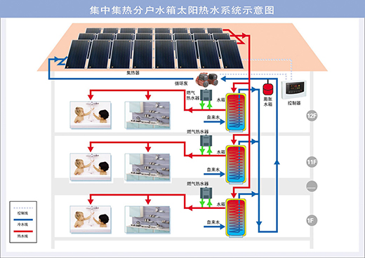 而分戶儲(chǔ)熱,是在集中儲(chǔ)熱的基礎(chǔ)上,增加的一道儲(chǔ)水設(shè)備,每一戶住宅都配備一個(gè)小儲(chǔ)水箱,讓業(yè)主也可以獨(dú)立管理熱水。同時(shí)每戶都配有燃?xì)鉄崴?,與太陽能熱水配合運(yùn)作,以保證自家的熱水供應(yīng)穩(wěn)定,熱水循環(huán)泵在其中依然發(fā)揮著水管內(nèi)循環(huán)熱水的作用。