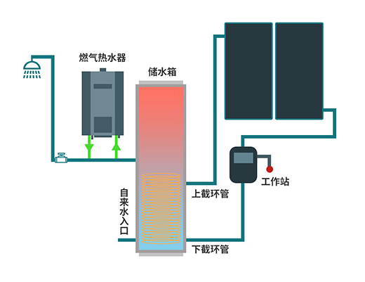 太陽能、燃?xì)鉄崴鳌崴h(huán)泵,三個(gè)主要設(shè)備并聯(lián)運(yùn)作,構(gòu)建了[ 即時(shí)熱水供應(yīng)系統(tǒng) ],告別等候熱水,讓熱水迎接自己。