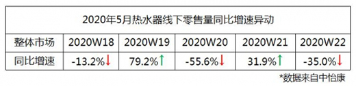 5月的熱水器市場究竟有多不淡定,來看看這份數據就知道了。第18周熱水器線下零售量同比增速下降13.2%,到了19周受到五一假期影響,增速達到79.2%,節(jié)后出現下滑,20周同比增速下降了55.6%,21周增速再度增長到31.9%,22周又逐漸回落,同比增速下降35.0%。