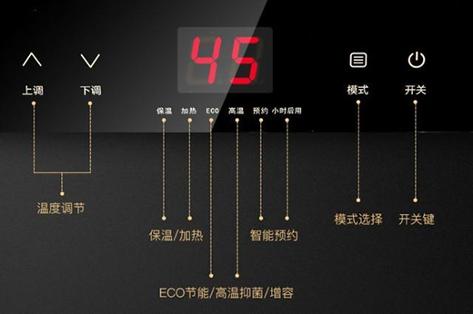 在操作控制面板上,我們可以看到布局非常清晰,全部采用觸控式的調(diào)節(jié),非常的現(xiàn)代化,最左邊的是溫度調(diào)節(jié)。并且可以通過(guò)模式來(lái)選擇保溫,或者是加熱,以及節(jié)能模式或者是預(yù)約模式。最右邊的是開(kāi)關(guān)按鈕,有點(diǎn)兒類(lèi)似微波爐的按鈕操作。