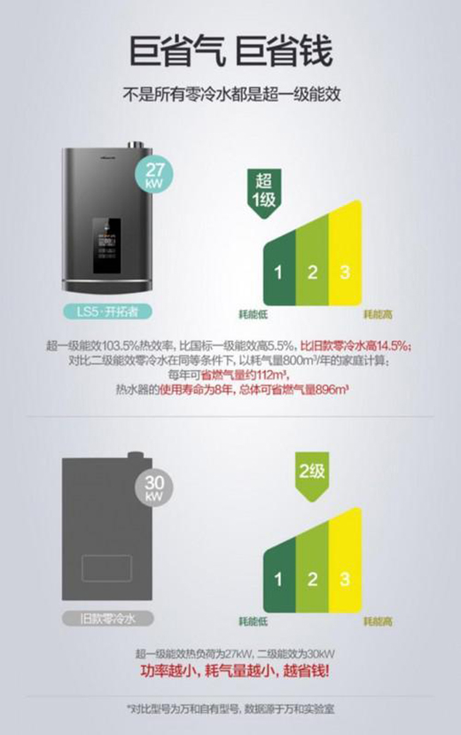 近日,燃氣熱水器頭部企業(yè)萬和率先推出了行業(yè)超一級能效零冷水燃氣熱水器,熱效率高達103.5%,比國標一級能效高5.5%,成為行業(yè)先行者。