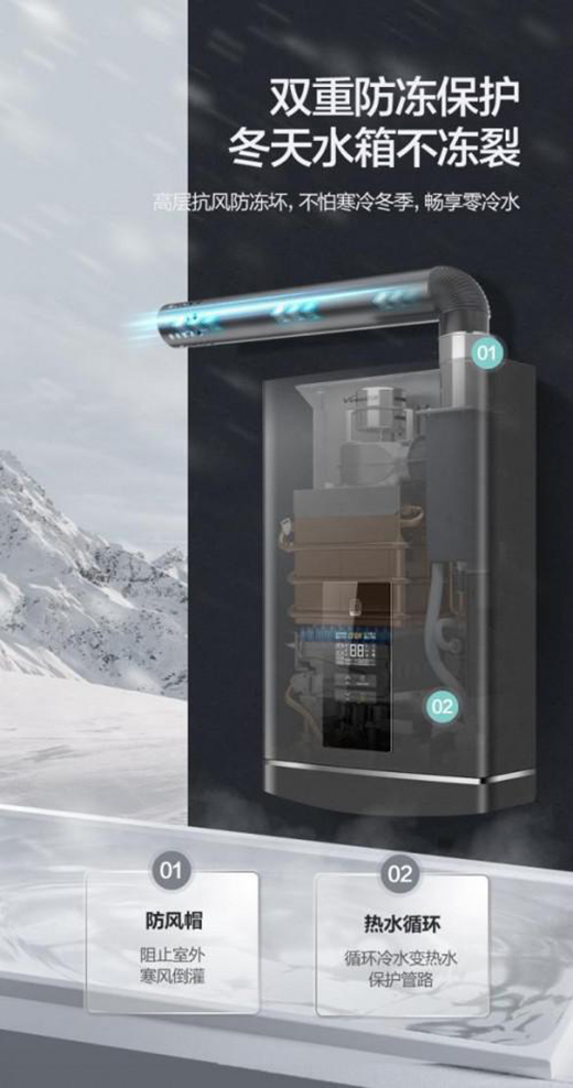 萬和LS5零冷水燃氣熱水器配有高性能防風帽,可有效阻止冷風倒灌,同時配有直流變頻水泵循環(huán)加熱系統(tǒng),有效防止機器凍壞凍裂。而直流變頻鼓暖風、火排循環(huán)燃燒技術,更有效地避免了水箱凍裂的問題,即使是零下極端的環(huán)境,依舊能夠使用自如。