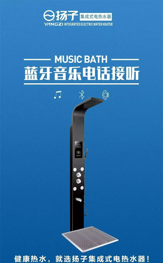 揚子集成式電熱水器內(nèi)置藍牙功能,可以讓用戶在洗浴的時候還能連接手機、播發(fā)音樂、接聽電話, 就是為了能讓用戶享受多元化的沐浴體驗,幫助用戶實現(xiàn)更高品質(zhì)生活。