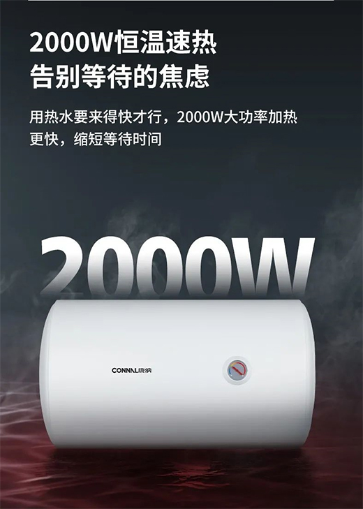 恒溫速熱2000W告別等待康納JAK熱水器擁有大范圍規(guī)格儲(chǔ)蓄內(nèi)膽,不同型號滿足不同家庭所需。2000W超大功率,加熱效果更出眾,縮短您的等待時(shí)間。
