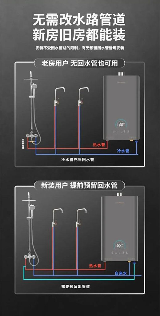 HX221A零冷水熱水器突破房屋管道布局限制,新房老房均可安裝,讓您無需擔憂安裝難題。新房裝修可以提前預埋回水管,使全屋做到零冷水、零等待;而老房想要換新機,也無需改造水管線路,只需在離熱水器最遠的浴室加裝單向閥,即可實現(xiàn)全屋零冷水效果。
