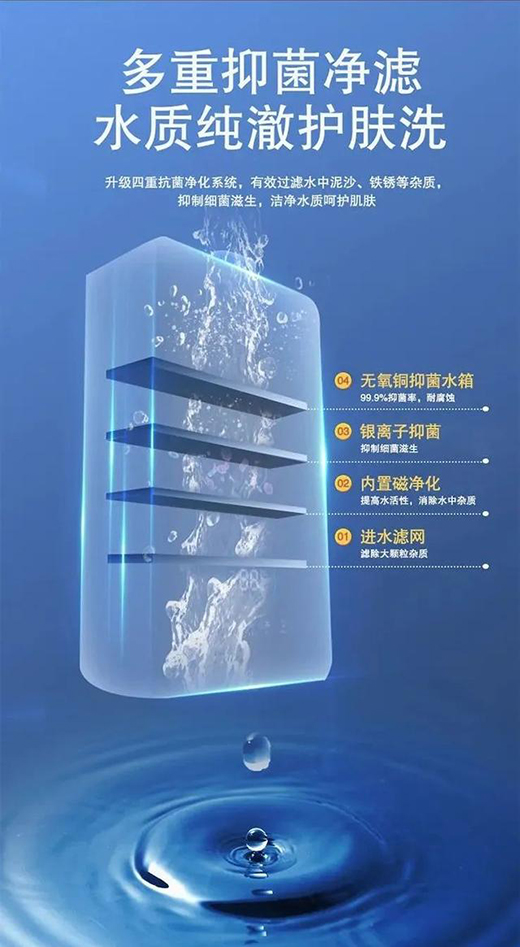 熱水器HX221A搭載四重凈水抑菌系統(tǒng),不僅層層過濾攔截水中雜質(zhì),還對水質(zhì)進行高效滅菌抑菌處理,還原潔凈水質(zhì),呵護肌膚健康,為皮膚敏感人群、年幼寶寶、孕婦等筑起凈浴健康保護墻,同時降低不良水質(zhì)對熱水器的影響,延長使用壽命。
