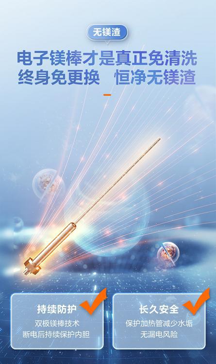 眾所周知,電熱水器通常采用鎂棒進(jìn)行防腐,然而,傳統(tǒng)鎂棒一般2年左右就需要更換一次,尤其是在部分水質(zhì)較差的地區(qū)鎂棒表面容易鈍化,被大量鎂渣污水包裹無法保護(hù)內(nèi)膽導(dǎo)致漏水,不僅污染水質(zhì),影響人們的健康沐浴生活,還容易引發(fā)安全隱患。
