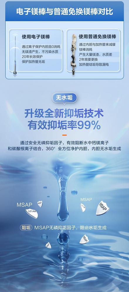 與普通鎂棒不同,美的一直走在熱水器研發(fā)前沿,持續(xù)技術(shù)迭代創(chuàng)新,全新推出“終身免清洗”電熱水器產(chǎn)品——恒凈電熱水器TF7,搭載電子鎂棒,其內(nèi)芯采用99.5%航天級(jí)純鈦材料,表面采用貴金屬銥坦涂層,高抗耐腐蝕,并且配備自主研發(fā)的AI智能芯片,能實(shí)時(shí)監(jiān)測(cè)水質(zhì),同時(shí)升級(jí)全新抑垢技術(shù),有效抑垢率達(dá)99%,全方位凈護(hù)內(nèi)膽,確保內(nèi)膽在全水質(zhì)工況下,達(dá)到完全防腐保護(hù),做到無渣污垢終身免消耗,不僅解決了用戶頻繁更換鎂棒的煩惱,提升水質(zhì)健康,更引領(lǐng)行業(yè)邁入鎂棒免清洗時(shí)代。