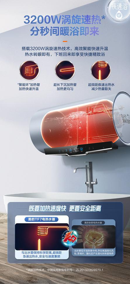 美的恒凈電熱水器TF7搭載3200W渦旋速熱技術(shù),采用“聚能環(huán)”加熱管,高效聚能快速升溫,并且超長(zhǎng)下沉加熱管,加熱更均勻,讓用戶下班回來即可快速暢享凈膚暖浴。