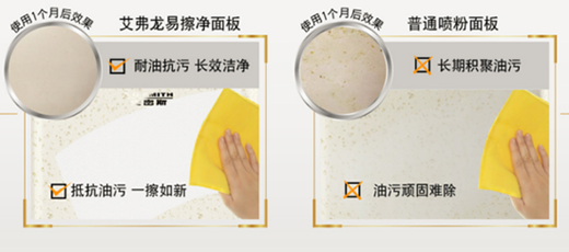 這是來自A.O.史密斯研制開發(fā)的艾弗龍易擦凈面板,一掃普通噴粉面板灰暗、容易藏污納垢的缺點(diǎn),經(jīng)過艾弗龍涂層、珠光涂層和底部噴漆三重噴涂,表面光滑如鏡,強(qiáng)力抵抗廚房油污。即使在充滿油煙的廚房里一個月,清理時也無需費(fèi)心,抹布輕輕一擦即可恢復(fù)原樣。
