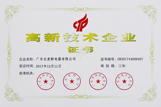 2017年在全體員工的共同努力下,經(jīng)過(guò)嚴(yán)格的層層審核,史麥斯電器實(shí)力榮膺由廣東省科學(xué)技術(shù)廳、廣東省財(cái)政廳、廣東省國(guó)家稅務(wù)局、廣東省地方稅務(wù)局所頒發(fā)的“高新技術(shù)企業(yè)”證書(shū)。高新技術(shù)企業(yè)的認(rèn)定,是對(duì)核心自主知識(shí)產(chǎn)權(quán)、科技成果轉(zhuǎn)化能力、研究開(kāi)發(fā)的管理組織水平、成長(zhǎng)性指標(biāo)等進(jìn)行綜合性的評(píng)審。
