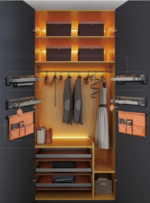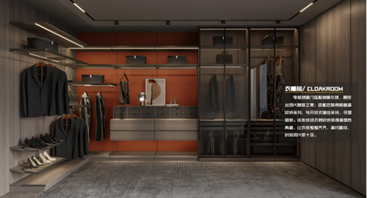 簡·愛保羅的衣柜精確把握年輕群體的消費(fèi)心理,以擁有高級質(zhì)感的中性灰作為主調(diào),輔以愛馬仕橙與金屬色作搭配。在簡·愛保羅設(shè)計師的手下,安靜的中性灰遇到耀眼的愛馬仕橙,打破原本傳統(tǒng)陰郁的空間氛圍,為單調(diào)的空間注入了新鮮活力,演繹出時尚經(jīng)典的別樣輕奢,最大程度地發(fā)揮衣柜的時尚魅力,給人以絢麗時尚的視覺觀感。